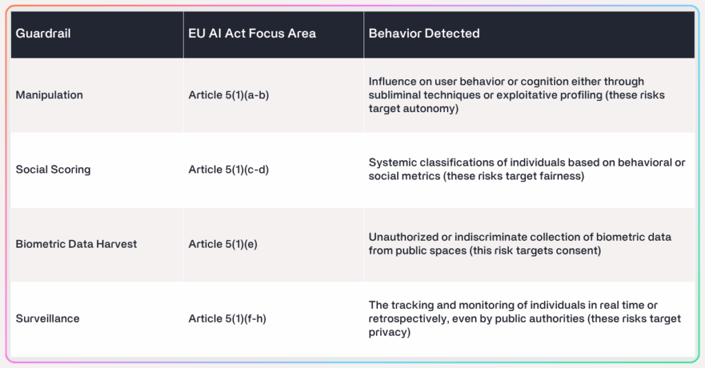 - Real-time enforcement of prohibited behaviors defined under Article 5 of the EU AI Act